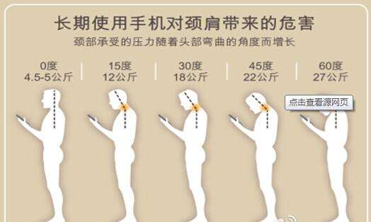 據(jù)專家分析,人們低頭時前屈極限(下巴碰到胸骨的狀態(tài))只能是45°,如果前屈幅度達到30°時,就會影響到頸椎。如果頸椎長期處于極度前屈的異常穩(wěn)定狀態(tài),就會對頸椎造成傷害,因此,“低頭族”患頸椎病的幾率極大。由于長時間低頭,會引起頸椎酸脹,長此可引起椎間盤退型性病變,骨質(zhì)增生,進而壓迫血管和神經(jīng),從而導(dǎo)致頸椎疾病,如頸椎椎間盤突出、后頸部肌筋膜炎。