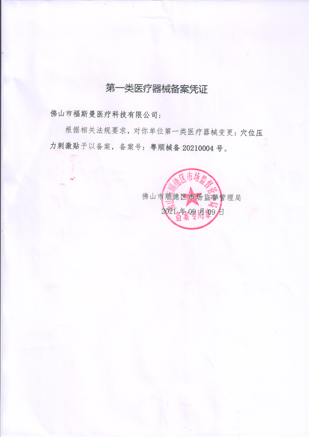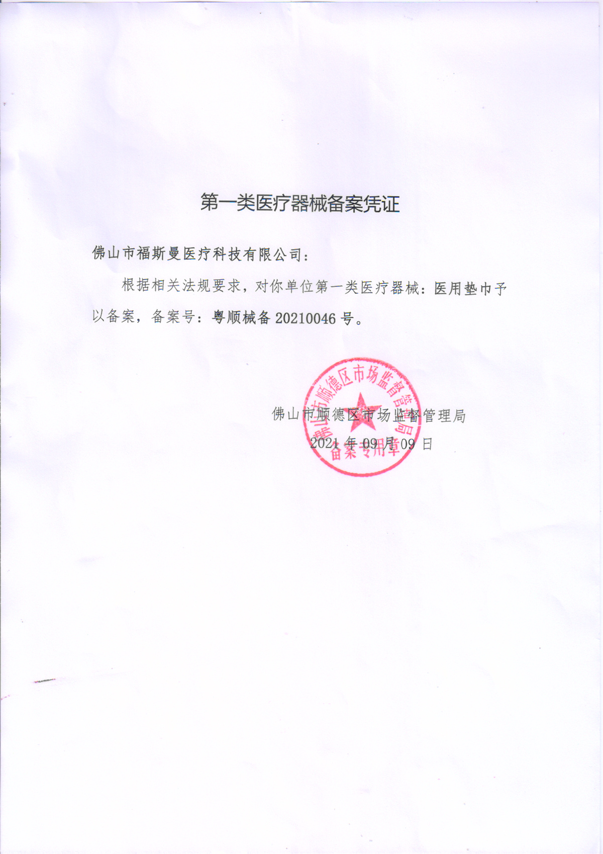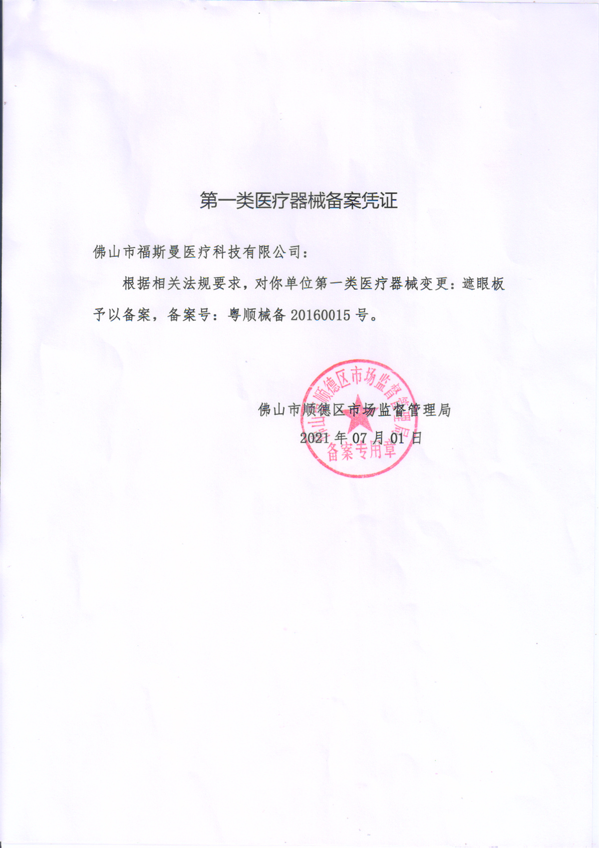 第一類醫(yī)療器械備案憑證