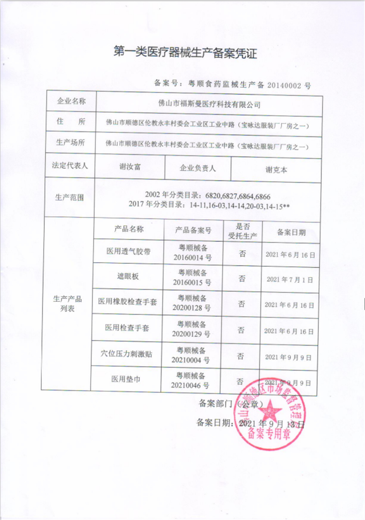 第一類醫(yī)療器械生產(chǎn)備案憑證