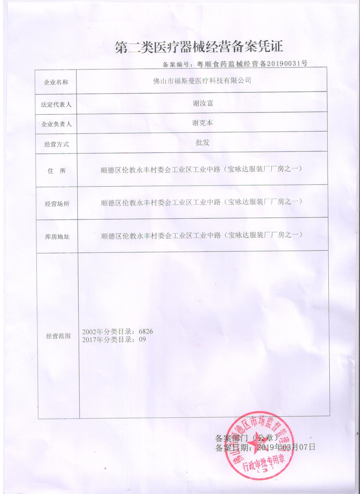 第二類醫(yī)療器械經(jīng)營(yíng)備案憑證